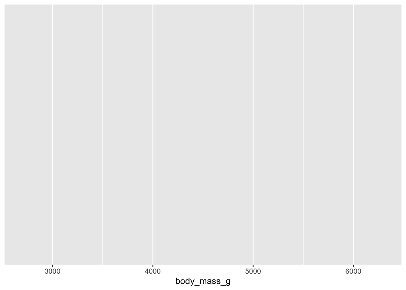 Next we have to specify the aesthetics. Since a histogram only has an x argument (our continuous variable: body_mass_g, in our case), that's all we need.