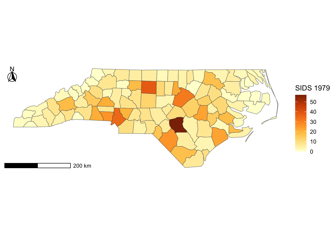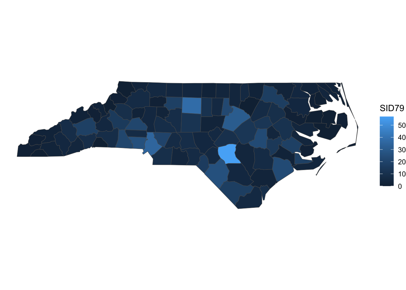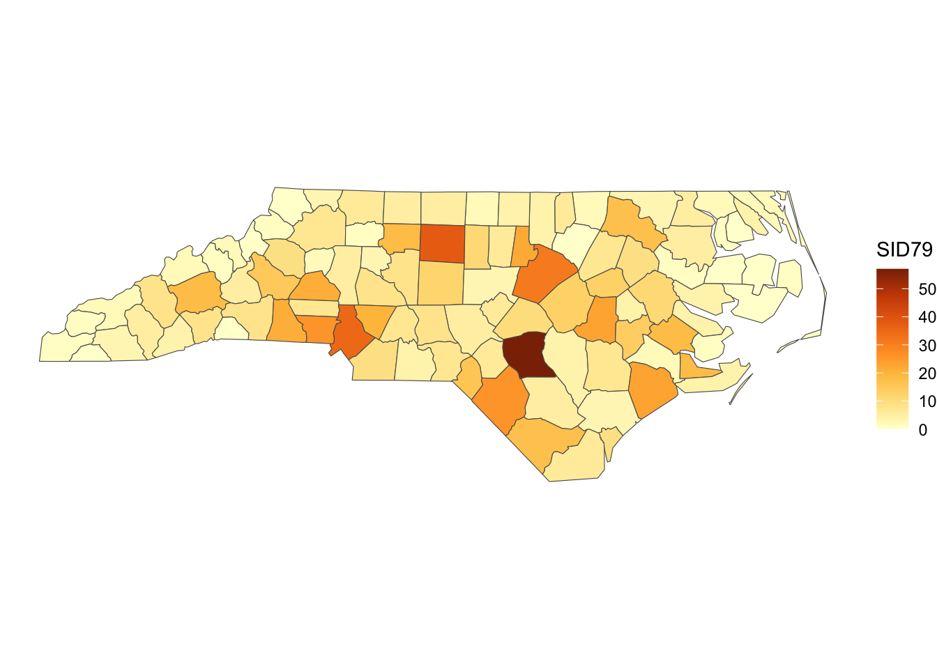 Great! This dataset has several attributes related to births and infant deaths. We’ll use the SID79, which is the number of sudden infant deaths in the year 1979 for each county.