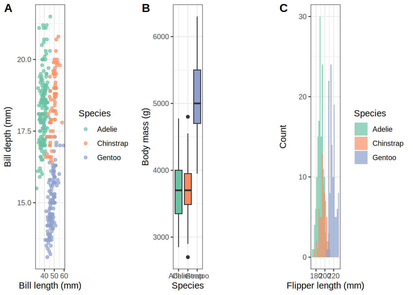 # Uncomment to install any missing packages# install.packages(c("ggplot2", "dplyr", "palmerpenguins", "patchwork", "cowplot"))library(ggplot2)library(dplyr)library(palmerpenguins)library(patchwork)library(cowplot)penguins <- palmerpenguins::penguins