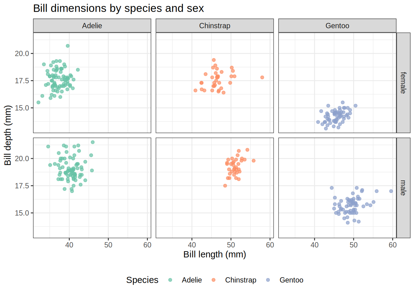 ggplot( penguins |>filter(!is.na(sex)),aes(x = bill_length_mm, y = bill_depth_mm)) +geom_point(aes(color = species), alpha =0.7, na.rm =TRUE) +facet_grid(sex ~ species) +scale_color_brewer(palette ="Set2") +labs(title ="Bill dimensions by species and sex",x ="Bill length (mm)",y ="Bill depth (mm)",color ="Species" ) +theme_bw() +theme(legend.position ="bottom")