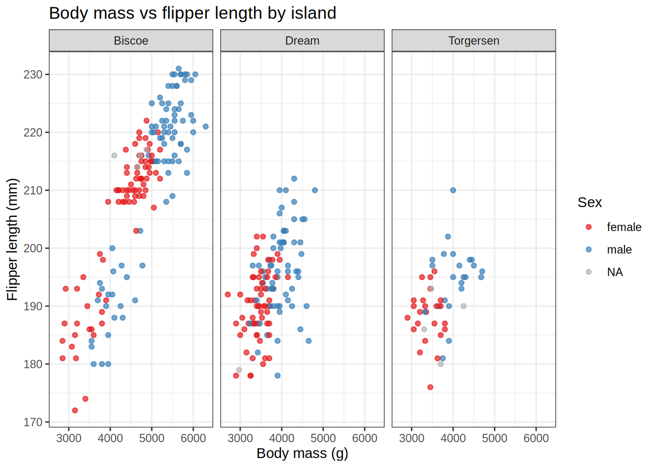 # One row of columns (equivalent to facet_wrap with fixed layout)ggplot(penguins, aes(x = body_mass_g, y = flipper_length_mm)) +geom_point(aes(color = sex), alpha =0.7, na.rm =TRUE) +facet_grid(. ~ island) +scale_color_brewer(palette ="Set1", na.value ="grey70") +labs(title ="Body mass vs flipper length by island",x ="Body mass (g)",y ="Flipper length (mm)",color ="Sex" ) +theme_bw()