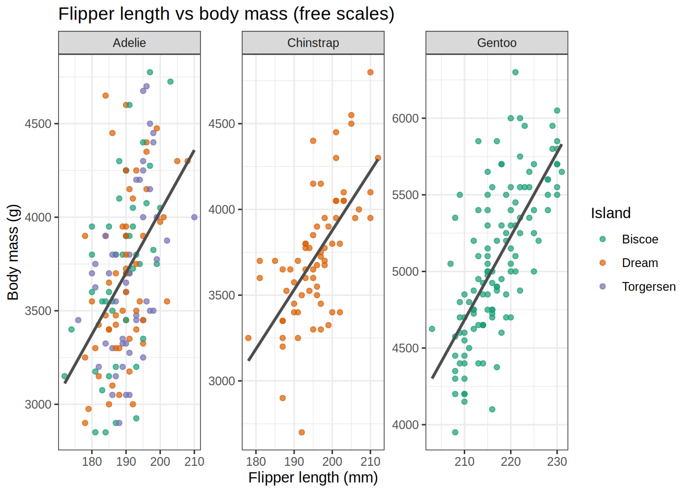 ggplot(penguins, aes(x = flipper_length_mm, y = body_mass_g)) +geom_point(aes(color = island), alpha =0.7, na.rm =TRUE) +geom_smooth(method ="lm", se =FALSE, na.rm =TRUE, color ="grey30") +facet_wrap(~species, scales ="free") +scale_color_brewer(palette ="Dark2") +labs(title ="Flipper length vs body mass (free scales)",x ="Flipper length (mm)",y ="Body mass (g)",color ="Island" ) +theme_bw()