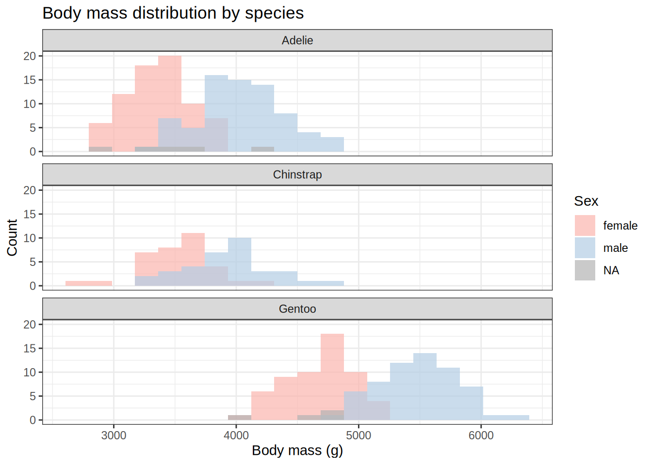 ggplot(penguins, aes(x = body_mass_g, fill = sex)) +geom_histogram(bins =20, na.rm =TRUE, position ="identity", alpha =0.7) +facet_wrap(~species, ncol =1) +scale_fill_brewer(palette ="Pastel1", na.value ="grey70") +labs(title ="Body mass distribution by species",x ="Body mass (g)",y ="Count",fill ="Sex" ) +theme_bw()