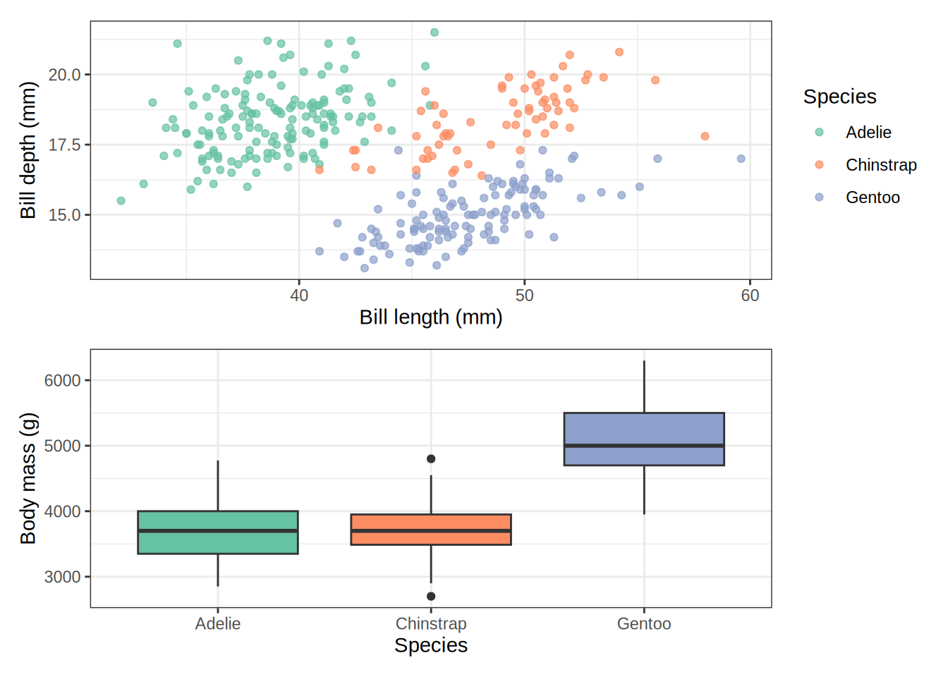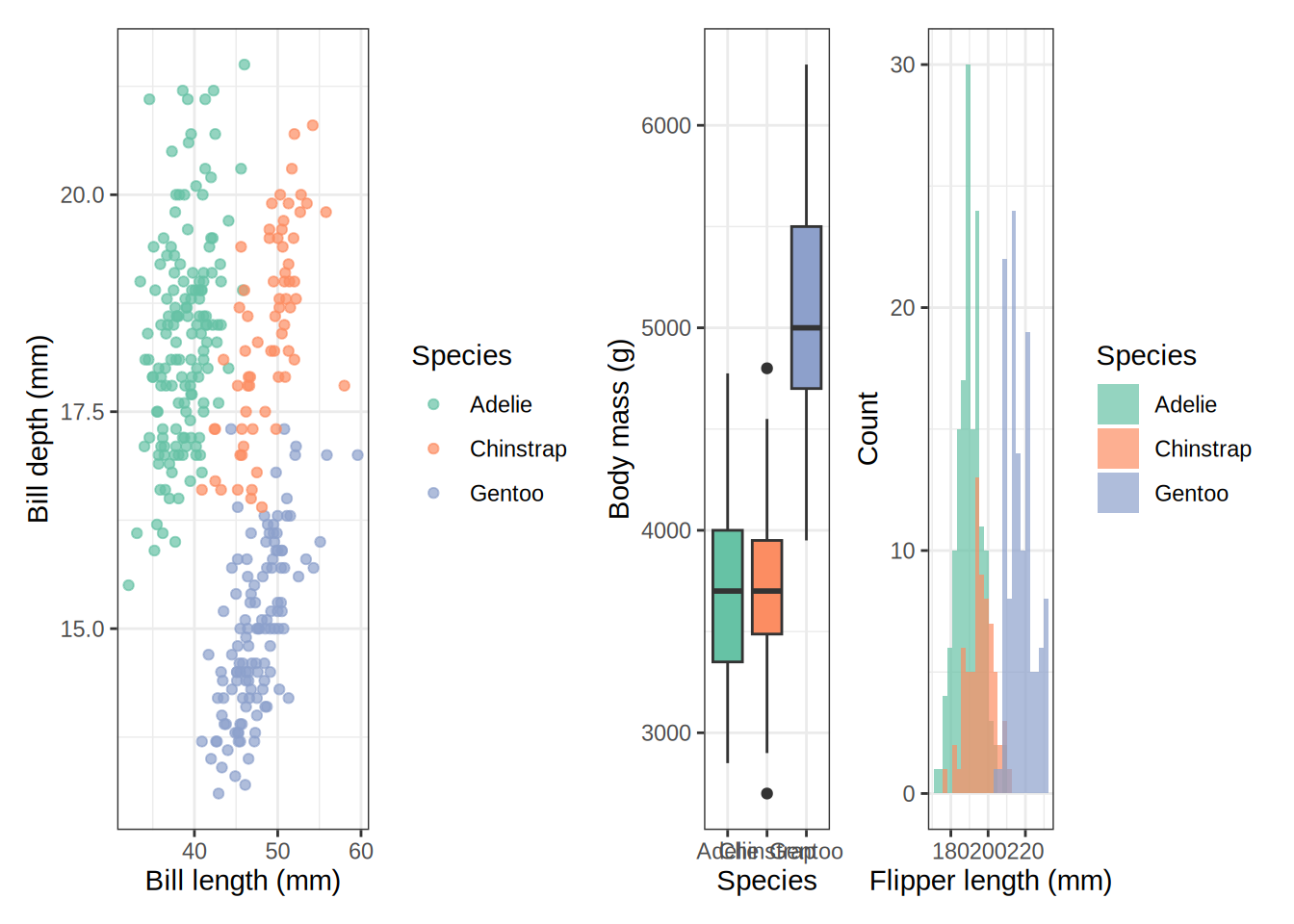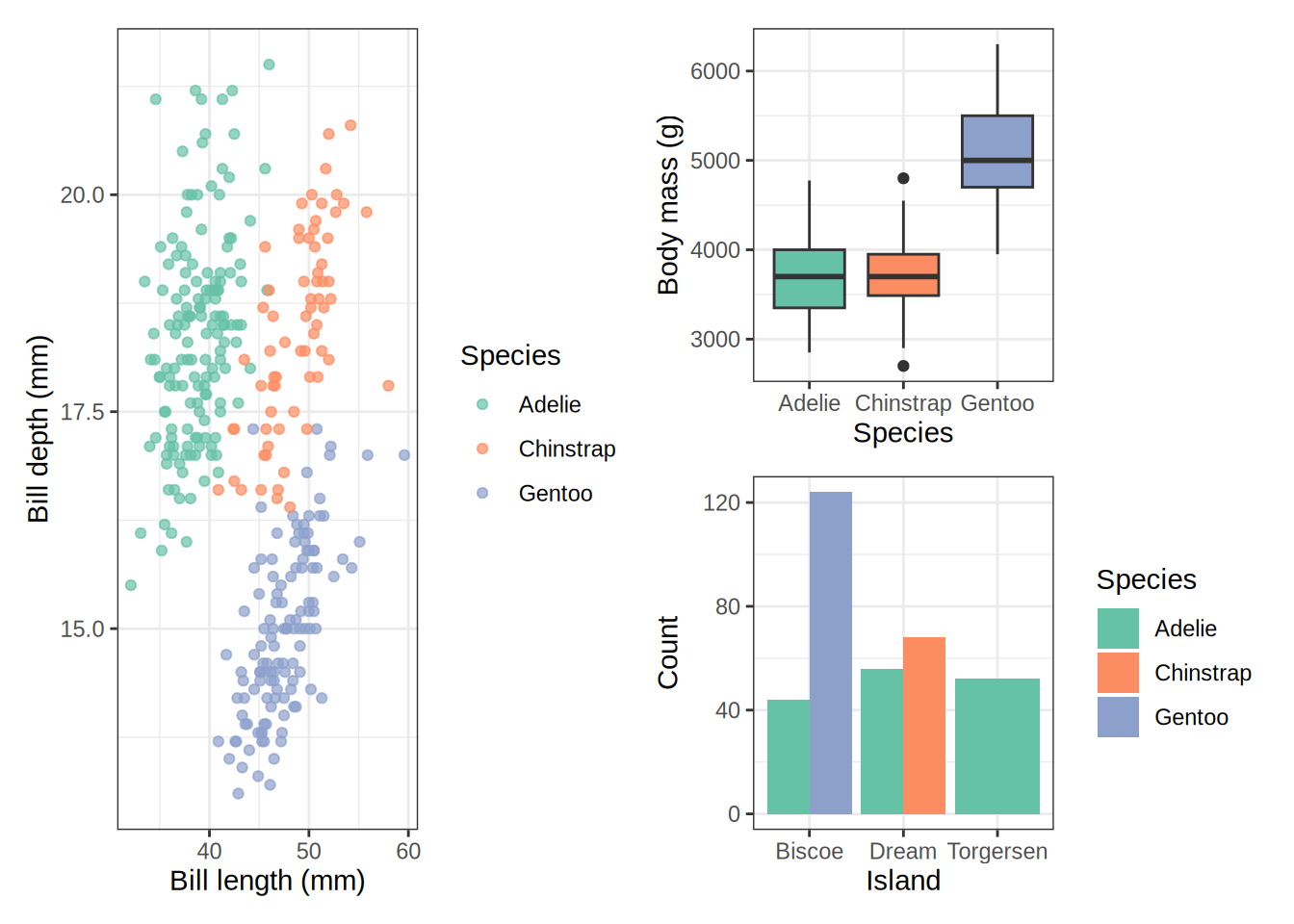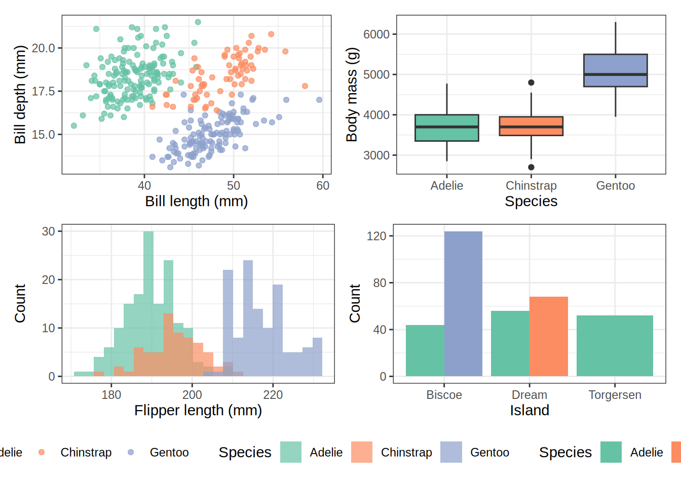 p_scatter <-ggplot(penguins, aes(x = bill_length_mm, y = bill_depth_mm,color = species)) +geom_point(alpha =0.7, na.rm =TRUE) +scale_color_brewer(palette ="Set2") +labs(x ="Bill length (mm)", y ="Bill depth (mm)", color ="Species") +theme_bw()p_box <-ggplot(penguins, aes(x = species, y = body_mass_g, fill = species)) +geom_boxplot(na.rm =TRUE, show.legend =FALSE) +scale_fill_brewer(palette ="Set2") +labs(x ="Species", y ="Body mass (g)") +theme_bw()p_hist <-ggplot(penguins, aes(x = flipper_length_mm, fill = species)) +geom_histogram(bins =25, alpha =0.7, na.rm =TRUE, position ="identity") +scale_fill_brewer(palette ="Set2") +labs(x ="Flipper length (mm)", y ="Count", fill ="Species") +theme_bw()p_bar <-ggplot(penguins, aes(x = island, fill = species)) +geom_bar(position ="dodge") +scale_fill_brewer(palette ="Set2") +labs(x ="Island", y ="Count", fill ="Species") +theme_bw()